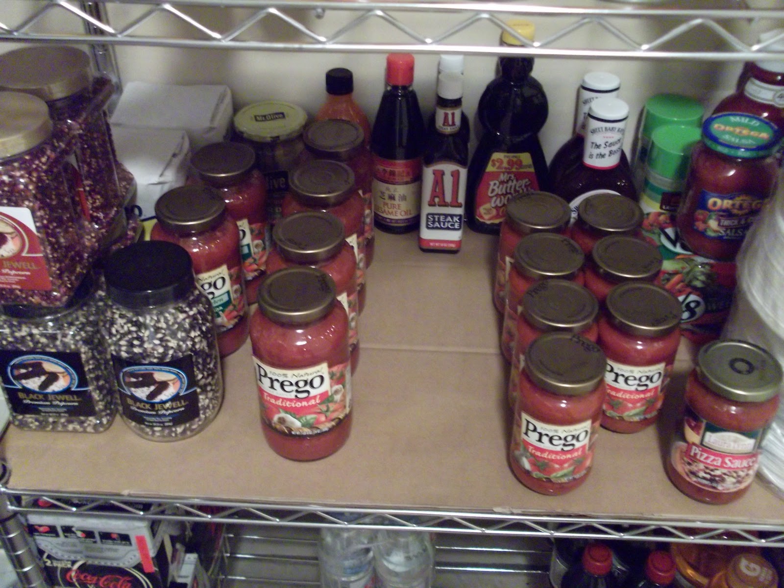 Ummmm, yes I prefer Prego.  And have you tried Black Jewel Popcorn? YUM!!  Oh, sorry.  ANYWAY, it's still a work in progress.  Even though everything is nice and stable now, I am afraid that if I pull that sugar out of the back I might knock a jar over, so when the budget allows and I find something good but cheap, I want to get some kind of mat to put in front of this unit in case something falls again.